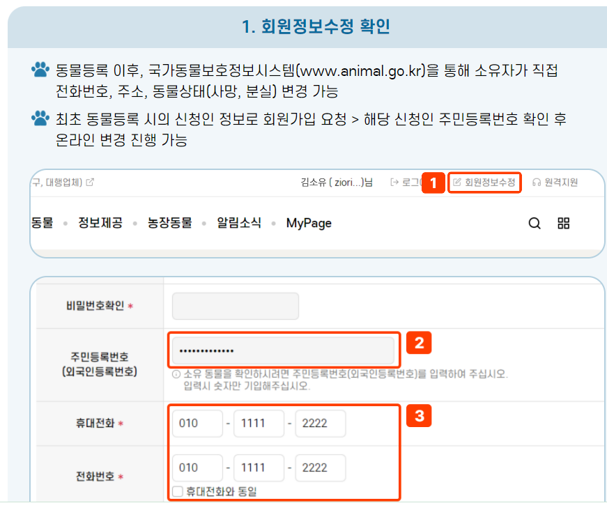 아래 화면에 보면 동물등록정보 연결 및 변경방법이 나온다!